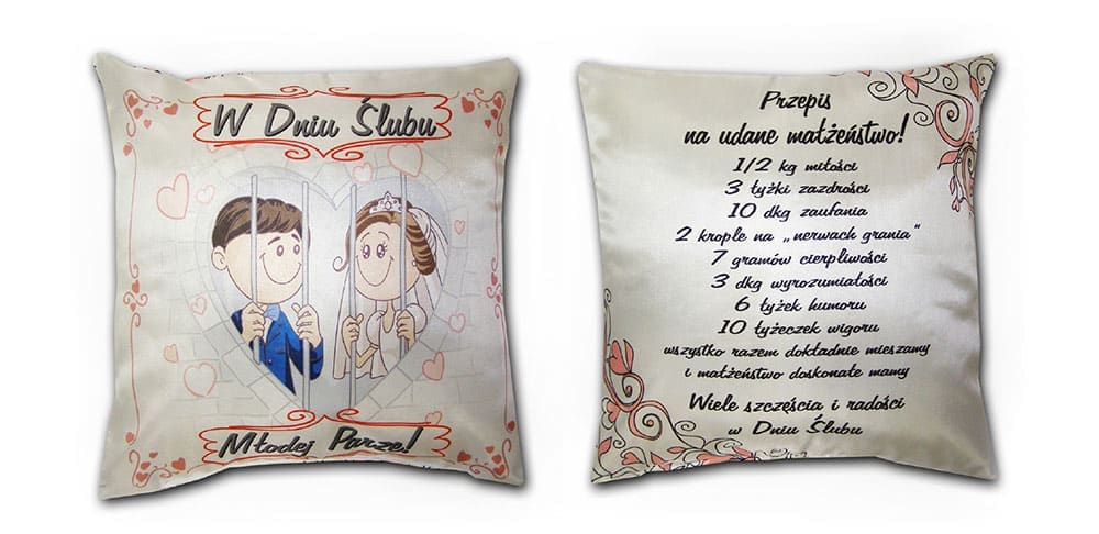 Poduszka zapakowana w folię, idealnie nadaje się jako prezent główny jak i upominek (dodatek) do prezentu.